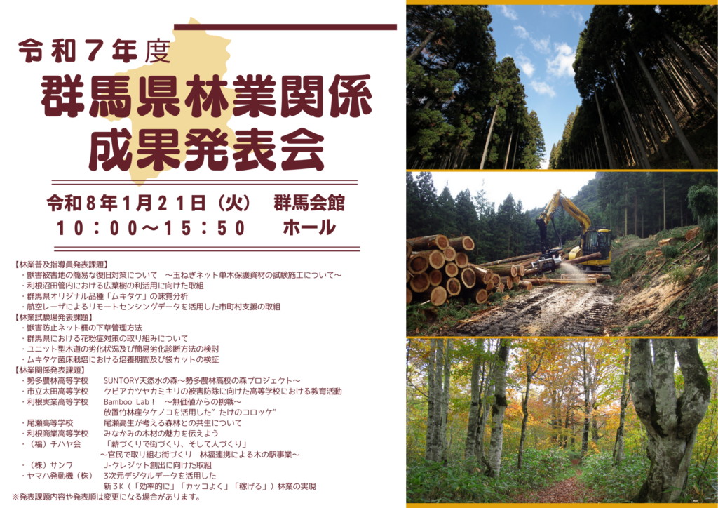 群馬県では、林業普及指導員及び林業試験場研究員、県内高等学校、企業・団体が、地域課題解決に向けた取組の成果等を発表し、新たな技術や取組を県民及び関係者へ広く周知することで、今後の林業普及指導や研究活動に役立てるため、「令和7年度群馬県林業関係成果発表会」を開催します。